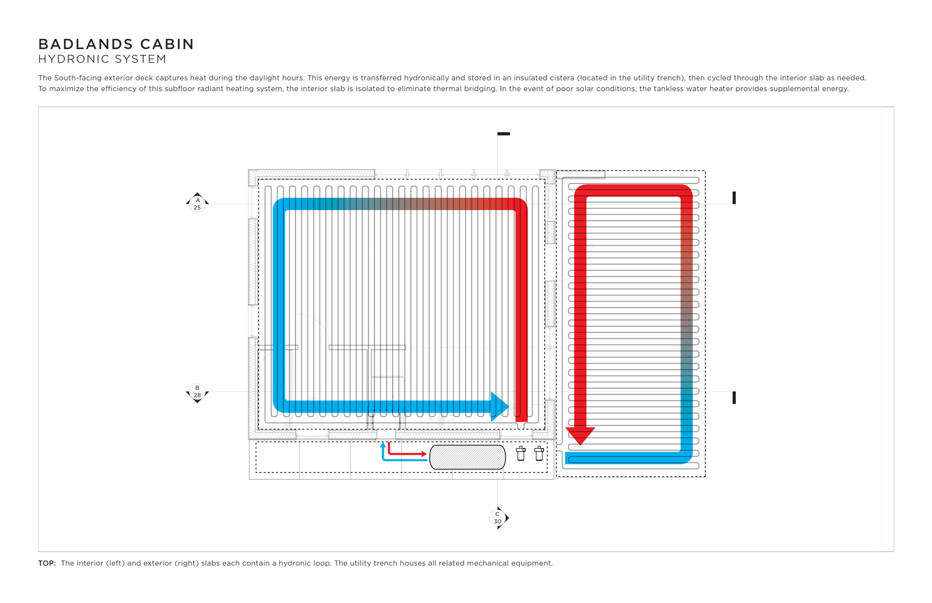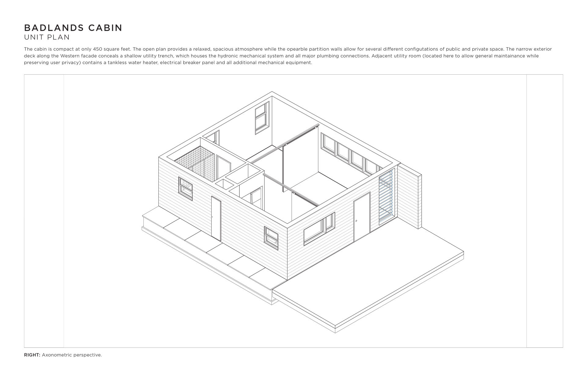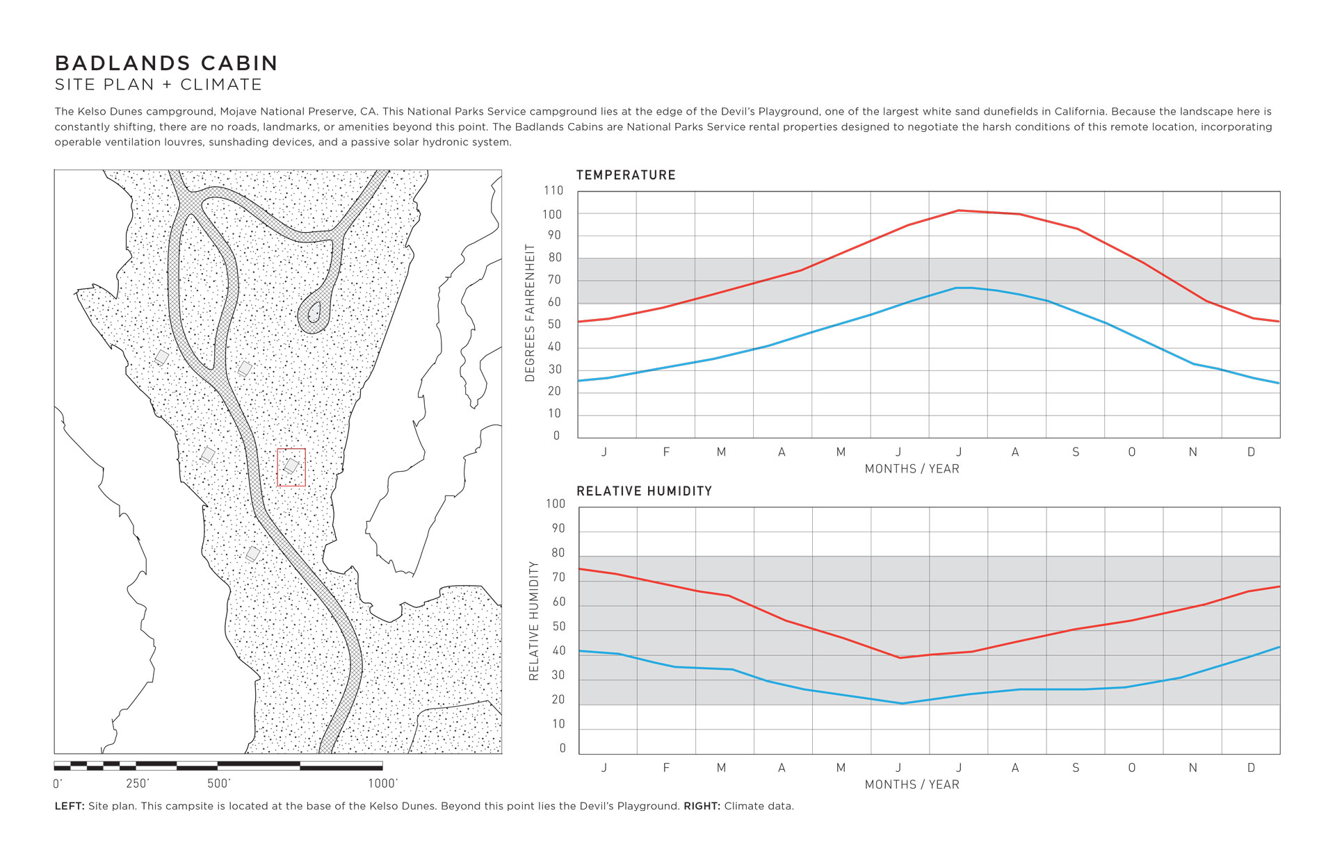 I designed this cabin for an area of the Mojave desert known as The Devil’s Playground. There is no water, there is no shade, sandstorms are frequent, the days are hot and the nights are freezing. This cabin makes light of this forbidding climate using operable ventilation louvres, sunshading devices, and a two-way passive solar hydronic subfloor system that both heats and cools year-round.