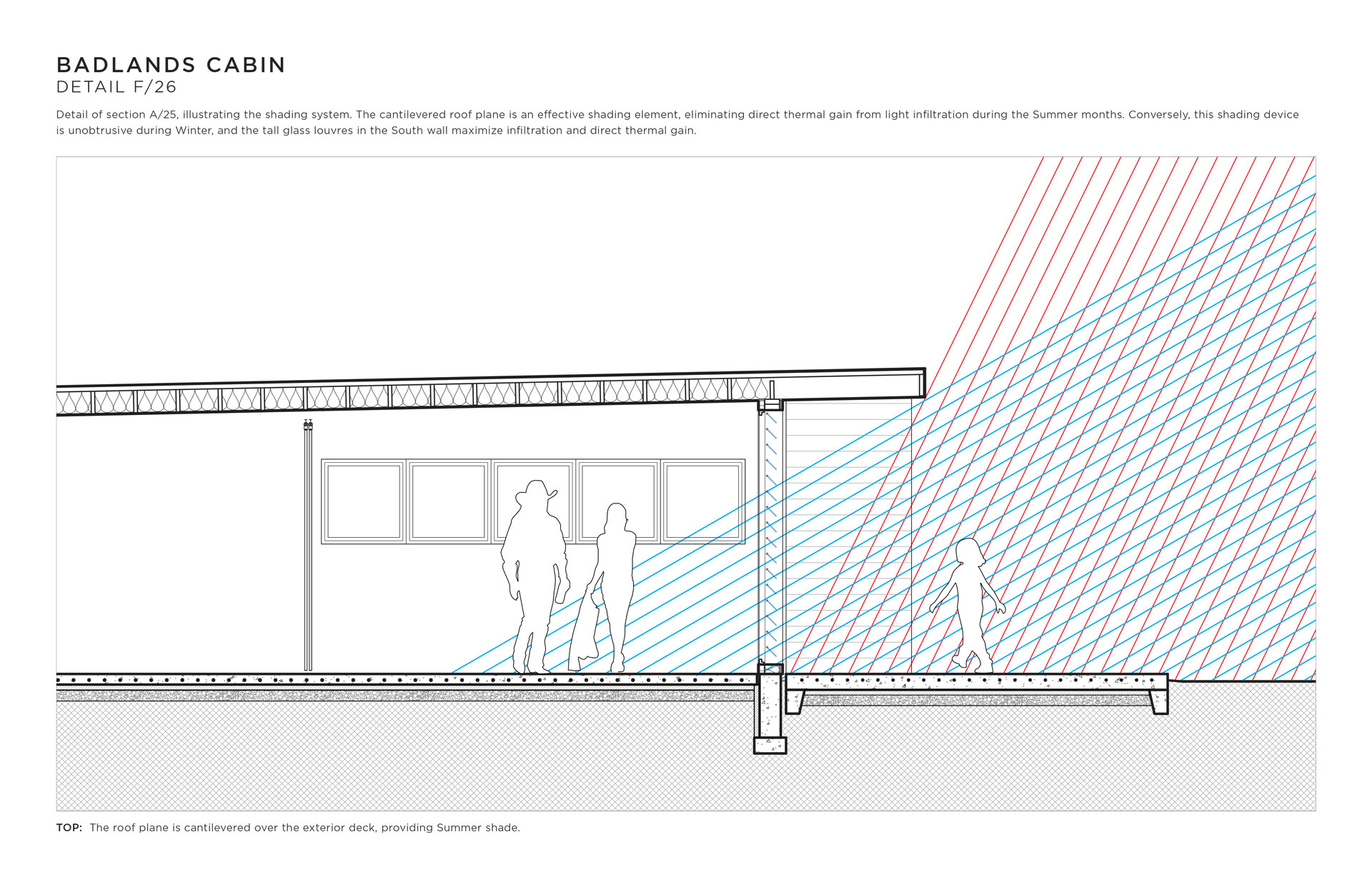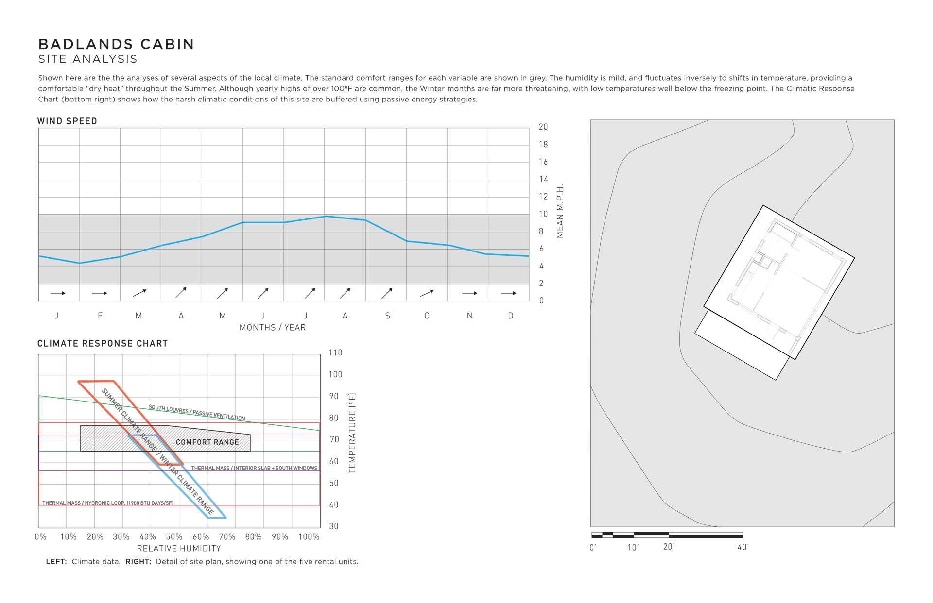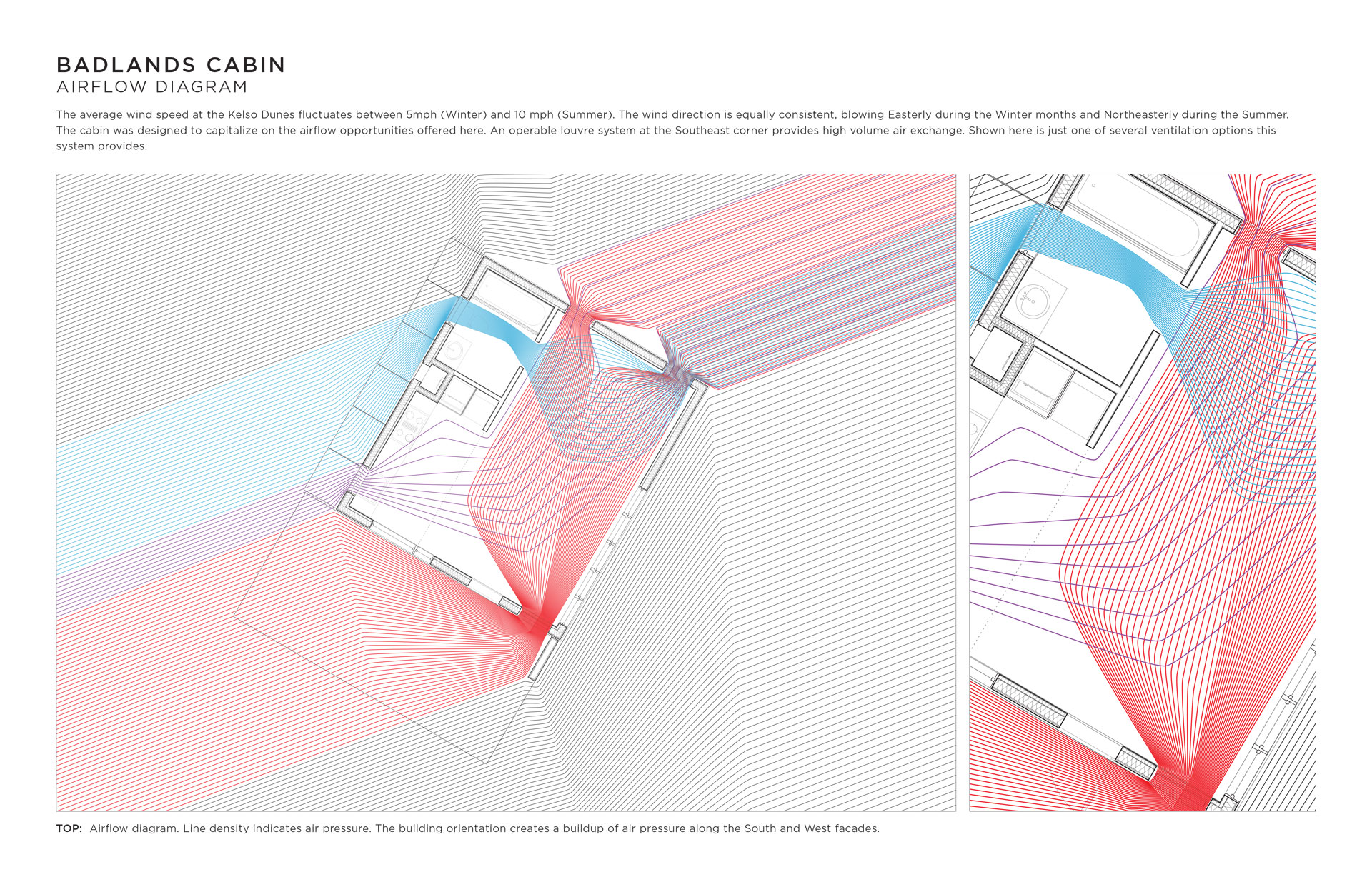 I designed this cabin for an area of the Mojave desert known as The Devil’s Playground. There is no water, there is no shade, sandstorms are frequent, the days are hot and the nights are freezing. This cabin makes light of this forbidding climate using operable ventilation louvres, sunshading devices, and a two-way passive solar hydronic subfloor system that both heats and cools year-round.